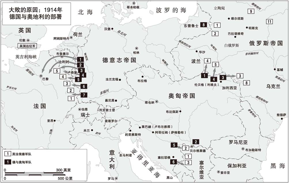 俄奥如已交战,把第二梯队调去打塞尔维亚,即会招来大祸。俄国已改善其铁路,已把数十个预备师改造为能迅速动员、出击的第一线师,从此不必等后备军人召集。这时俄国已有九条新铁路,其中五条是双线,直抵与德、奥接壤的边境。沙皇从此能把九十六个步兵师和三十七个骑兵师(三十个军两百七十万兵力)迅速投入战场,且有来自西伯利亚与亚洲移动较缓慢的两百三十万兵力后备。[8]每个人都认为意大利的二十五个师最后会投入反奥阵营。胜败全看奥地利能否在东部战线挺得够久,让柏林得以先解决西线战事,再移师东线与俄国一决。但即使是这一先决条件,主事者都没有把握守得住;一九一四年五月最后几次参谋人员会谈时,毛奇只说他希望在六星期内打败英法。如果不成,奥匈帝国就会像用手指头堵住堤坝缺口的荷兰小男童,只能独自力撑。[9]