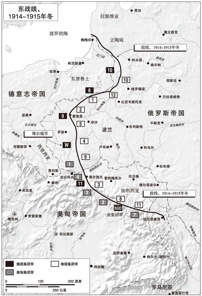俄国第九集团军的军需主任哥洛文忆道,步枪极为不足,致使西南方面军司令部指示他以长柄斧头作为他步兵团的武器,称他们为“戟兵”。[8]戟兵完全得不到炮兵掩护。喀尔巴阡山脉的某位俄国炮兵军官报告,师司令部对他的炮兵连下达了以下命令:“立刻报告几天前是谁下令打十二发榴霰弹。”[9]俄国样样东西奇缺,乃是奥匈帝国能存活到一九一五年的最大因素。俄国若有充足的武装和补给,将轻易就把奥地利击垮,使其退出这场战争。但他们没有,而鲁登道夫,在俄国的虚弱里,而非奥地利的强大里,瞥见一线希望。一如德国人发动战争以“拯救”奥匈帝国,此刻他们加剧战事以重振这一君主国。鲁登道夫于一九一五年一月提醒法尔肯海因,“奥地利的紧急状况乃是我们无法预料的大变量”,[10]得将它搞定。