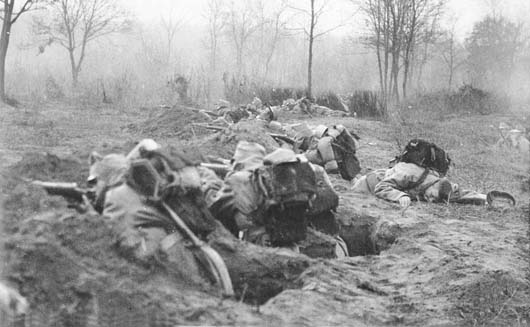 俄军在喀尔巴阡山脉的进攻,和先前奥军在加利西亚的进攻一样不智。照片中的场景是一九一四年十二月掘壕固守的奥地利步兵击毙来犯俄军。