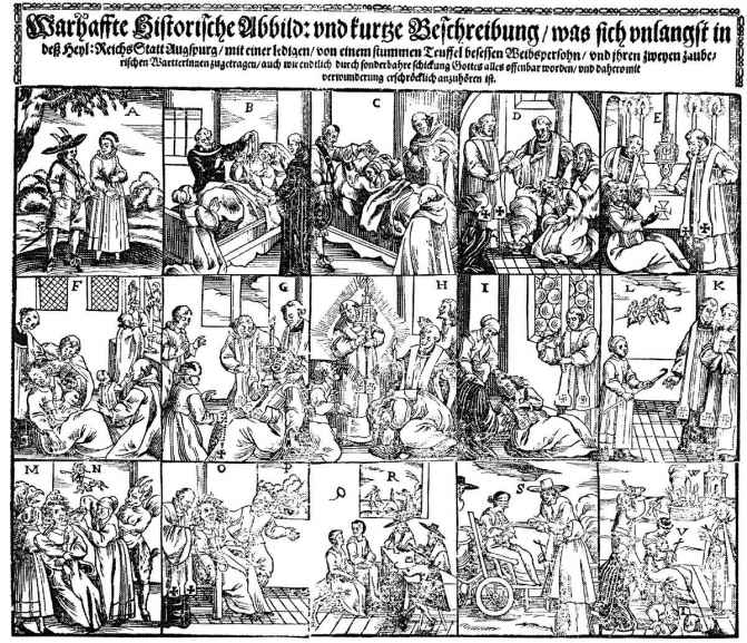 图8 对驱魔及猎巫(女巫和她的两个助手)方法的详细描绘。沃尔芬比特尔的奥古斯特大公图书馆传单收藏室藏。