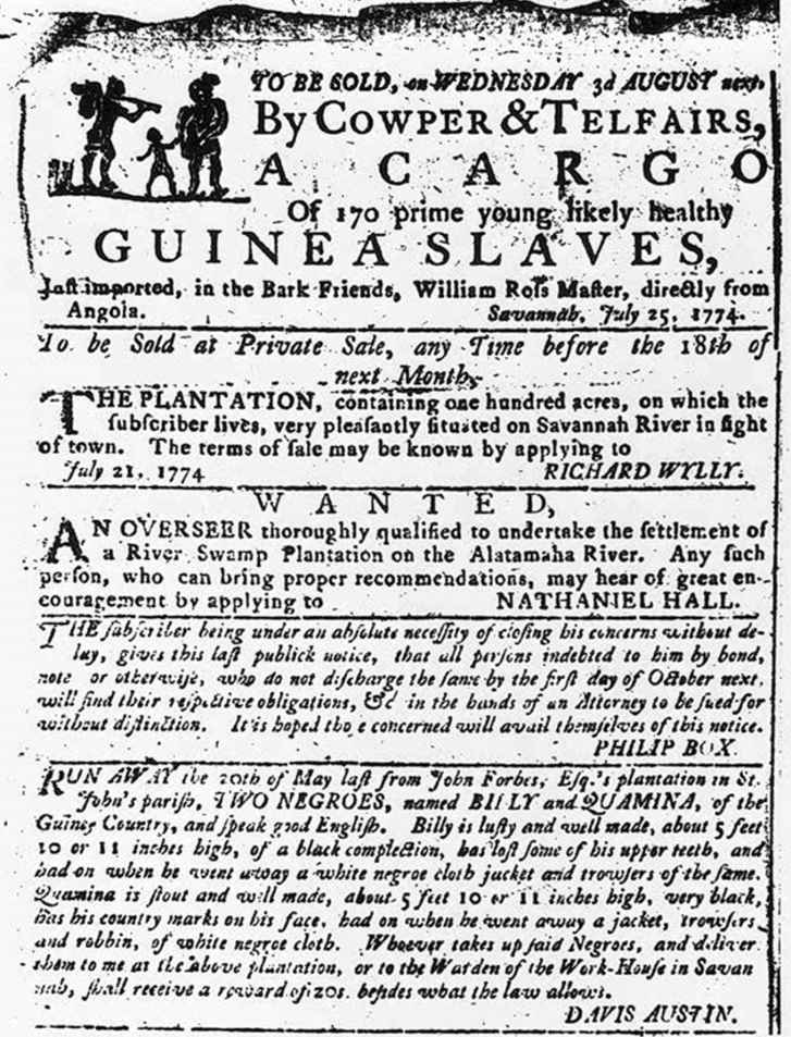 图17 1774年萨凡纳的一张奴隶拍卖的单页广告。这页广告反映了革命前夕南方的奴隶现实。具体到萨凡纳普遍趋势来说,越来越多的奴隶是直接从非洲进口的。从1755年到1767年左右,在萨凡纳的奴隶中,有大约60%来自加勒比地区,大约25%来自非洲国家。不过,在1768—1771年左右,来自非洲的奴隶比例上升至86%(广告中的奴隶来自几内亚)。这页广告除去出售奴隶之外,还有一则出售种植园的消息,以及一则招聘种植园看守的工作启事。后者表明很多主人都不在自己的种植园居住,这也凸显了奴隶主和奴隶的距离。不过,其中最引人瞩目的还是两个奴隶(比利和夸米那)逃跑的消息。从夸米那面部的“国籍印记”来看,他可能来自非洲。由美国国会图书馆印刷品与照片部友情提供 [LC-USZ62-16876(1-2)]。