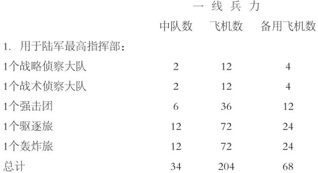 1.用于海军基地防空:10个水上驱逐机中队,共有60架第一线飞机及20架备用飞机。