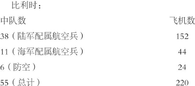 在首次动员后,比利时航空兵部队的总兵力如下表: