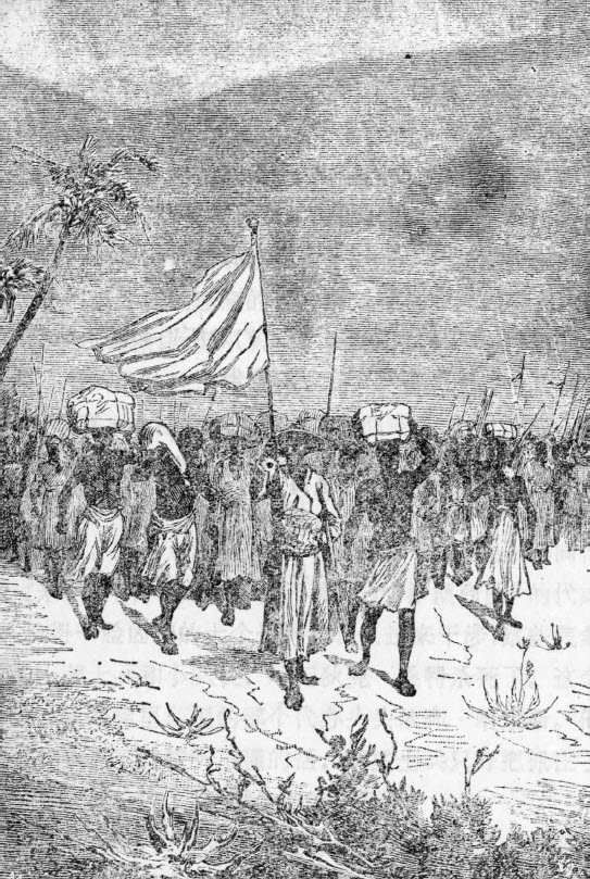那些奴隶贩子、脚夫、士兵、奴隶全都站起身来。那些身背包裹的囚犯被分成了几个小队,每支小队由一个监工带领。这些监工每人手中举着一面色彩鲜艳的小旗子。