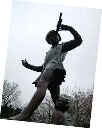 在肯辛顿公园的一条小径上,相信就是当年巴利遇见潘彼得的地方,现在竖立着一尊青铜雕像。穿树叶短衫的潘彼得站在顶端,小仙人丁克铃,还有达林家的孩子们:温迪,约翰和迈克尔。在正大光明的蓝天白云下,童话里的人物就这样一一站在六月肯辛顿公园的绿树前。他们就像爆竹红纸里的那段火药引子,将人心里不愿长大的愿望,从岁月的死静中引爆,嘭的一声炸得满地碎红。“这世界上有谁想长大呢?”提问的声音从这股硝烟里响起,有无限的委屈。
