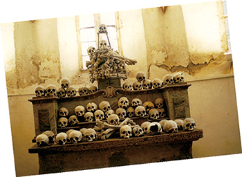 十六世纪的大洪水过后,沿河教堂的墓地里,竟腾不出这么多地方来安葬死人。于是,人们将旧坟墓打开,将旧尸骸取出,给新死者腾地方。旧骸骨被集中放在教堂里,大多数人只能保留下头盖骨。不过,人们还是尽力护着死去处女的尸骨。她们的头盖骨单独被放在一边,人们专门在她们的头骨上画了一圈花环,有的是玫瑰花环,有的则是百合花环,将她们与一般的尸骨区别开来。在教堂的安息室里,人类被分成两种:处女和非处女,而不再是男人和女人。纯洁比什么都重要。