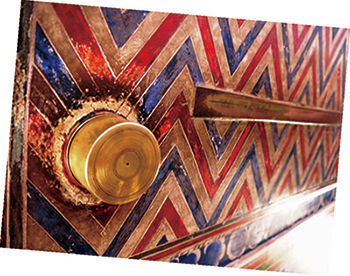 我看见,猛烈的阳光里有一扇蓝色的小木门,里面是一间幽黯的小房间,墙上画着红蓝相间的波纹。墙上有一个凹处,墙下有条用金条包着的细缝,旁边还有一个金子做的旋钮——国王的听雨室。
