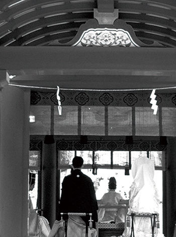 ◆ 镰仓八幡宫前的婚礼,没有人欢笑,新人穿黑白两色,来宾静默端坐,佩戴白色纸花。在鼓和三弦以及尺八伴奏下,盛装的男人高歌,发出苍凉悲恸的歌声,哀悼人生一些永远的失去。庙堂门上,祝福的折纸也是白色的。