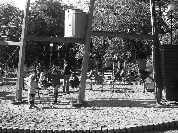 这些设备通常建立在沙池里,摔了也不会太疼。一方面可以玩沙,堆沙堡;另一方面保护孩子们,摔倒或跳下来的时候有缓冲,不致受伤。设施的设计通常都考虑了对孩子身体力量和柔韧度的有效性。这个主题乐园藏在景色如织的森林深处,孩子们一见那些绳梯啊、蛛网啊、滑梯啊、秋千啊什么的,无不兴奋至极,踊跃地投入了疯玩的海洋。哥德堡多雨,但撑雨伞者鲜见:一是哥德堡风大,伞骨容易折断,二来大人孩子从小都习惯了冒雨游玩。话说哥德堡三天一大雨,两天一小雨,随身带伞确实麻烦。怎么办?从衣服上入手!